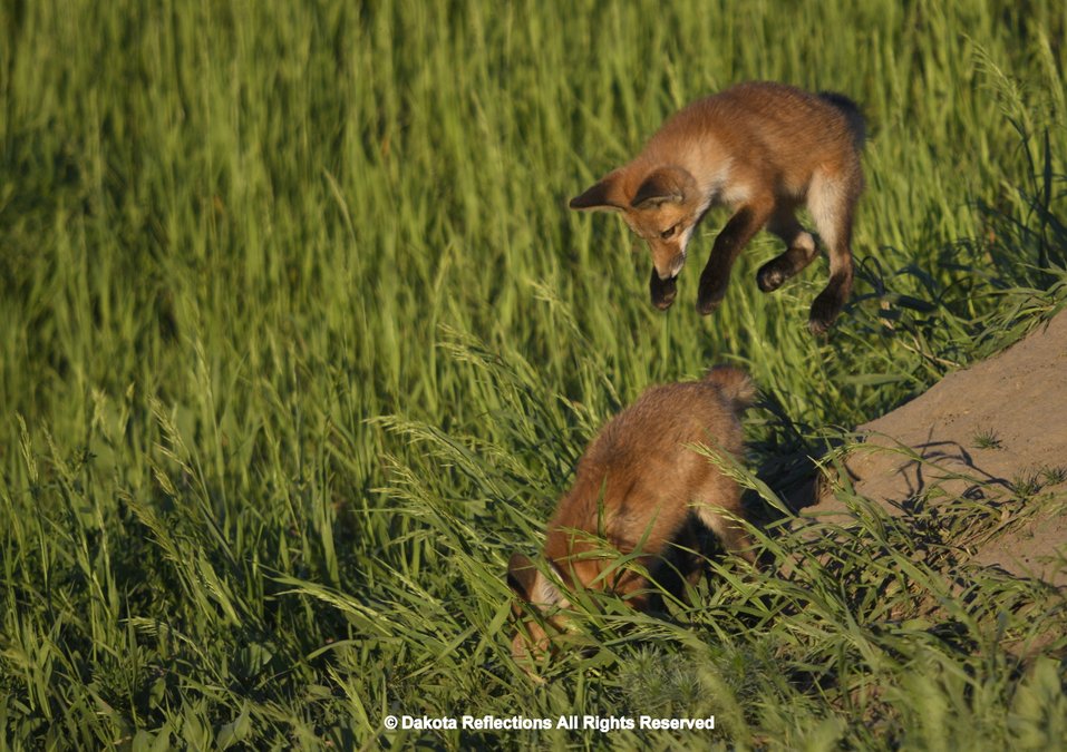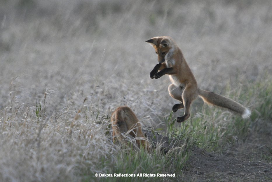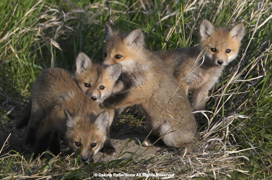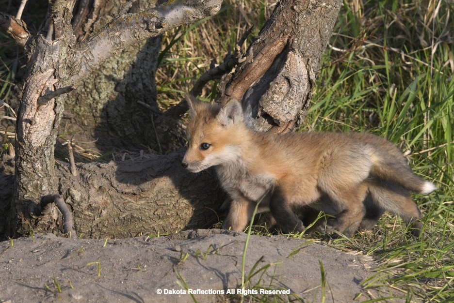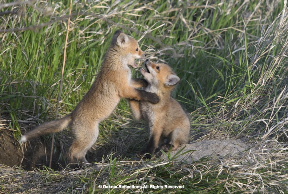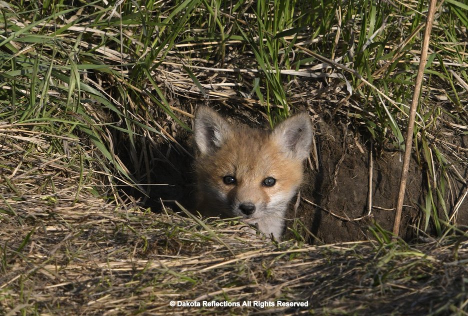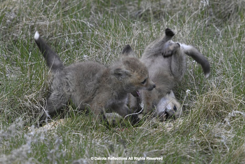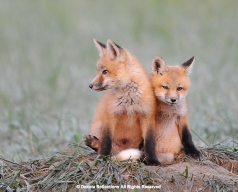 The den is dug by the fox family or modified from an abandoned badger burrow. Mating occurs during the winter with pups born in the spring after a gestation of 51 to 53 days. Litter size averages 5 with a range of 1 to 13. The kits weigh about 6 ounces at birth and their eyes open about 2 weeks of age. Their color is charcoal gray at birth. At two weeks the vixen can leave the den for hunting and the kits can maintain their body temperature in the den. At 1 month, the kits will begin fighting among themselves and establishing a pecking order from alpha to the omega. They are nursed for 2 to 2 ½ months. In early May, the kits are be seen for varying periods of time outside the den. They become more social and playful. At 5 weeks of age, their coat becomes lighter and matches more the surrounding dirt. Red fox hairs become evident and they begin to look more like their parents. By June in the Northern Plains, kits are accompanying their parents on hunting trips. By September to October, the kits have left the family, except some females may remain and assist in child raising next spring.