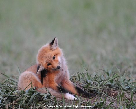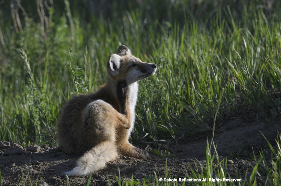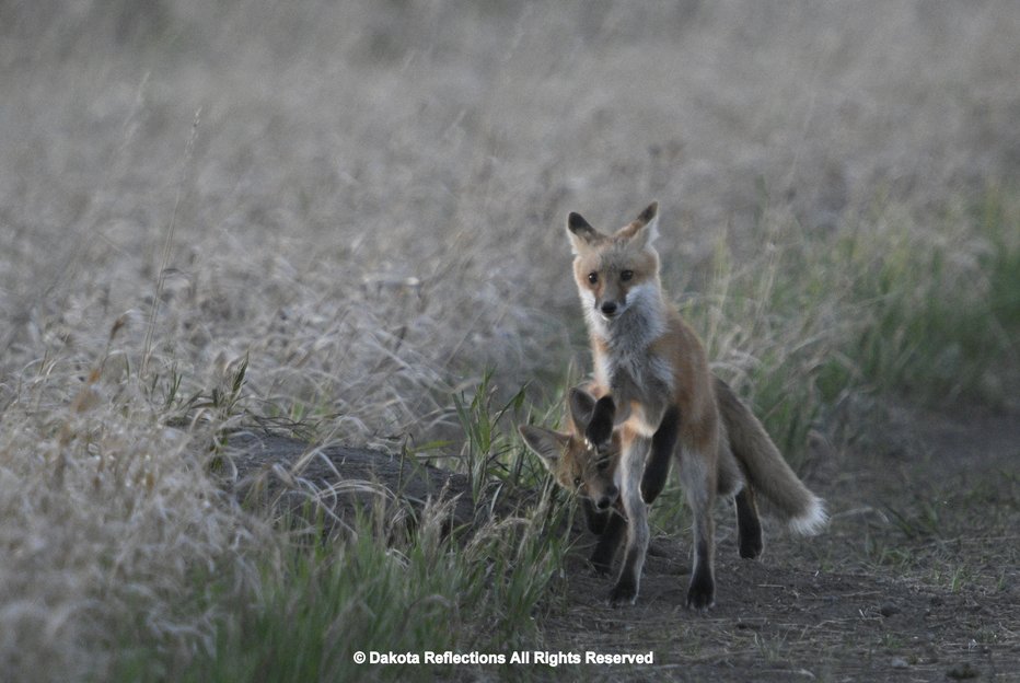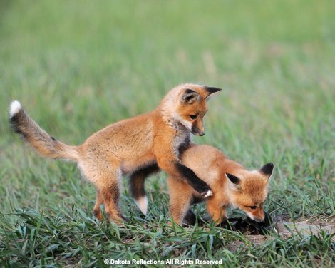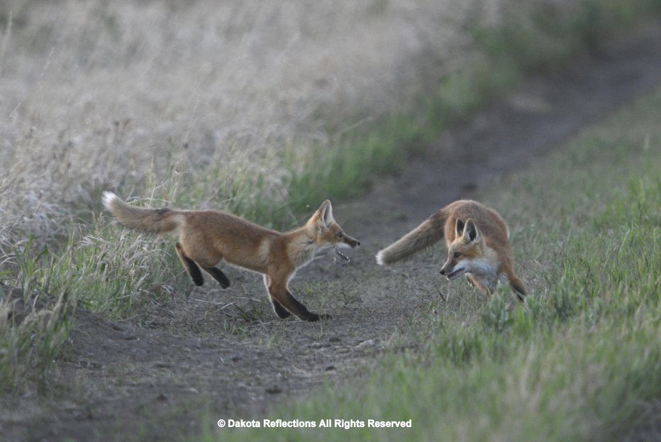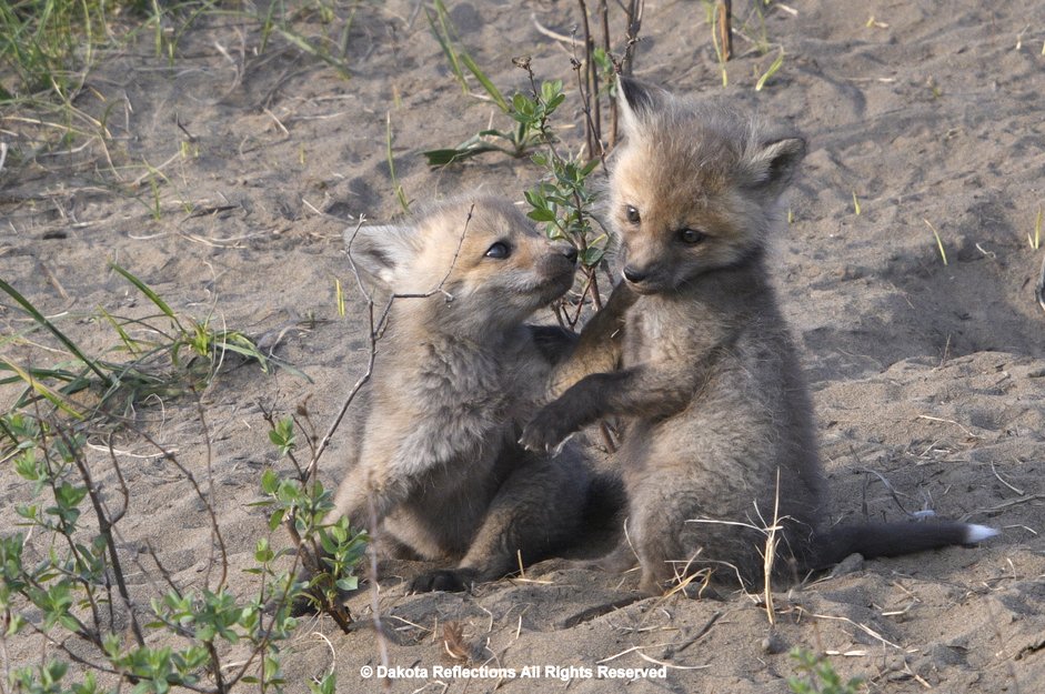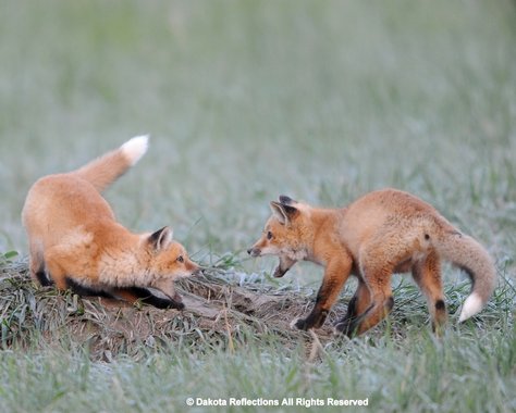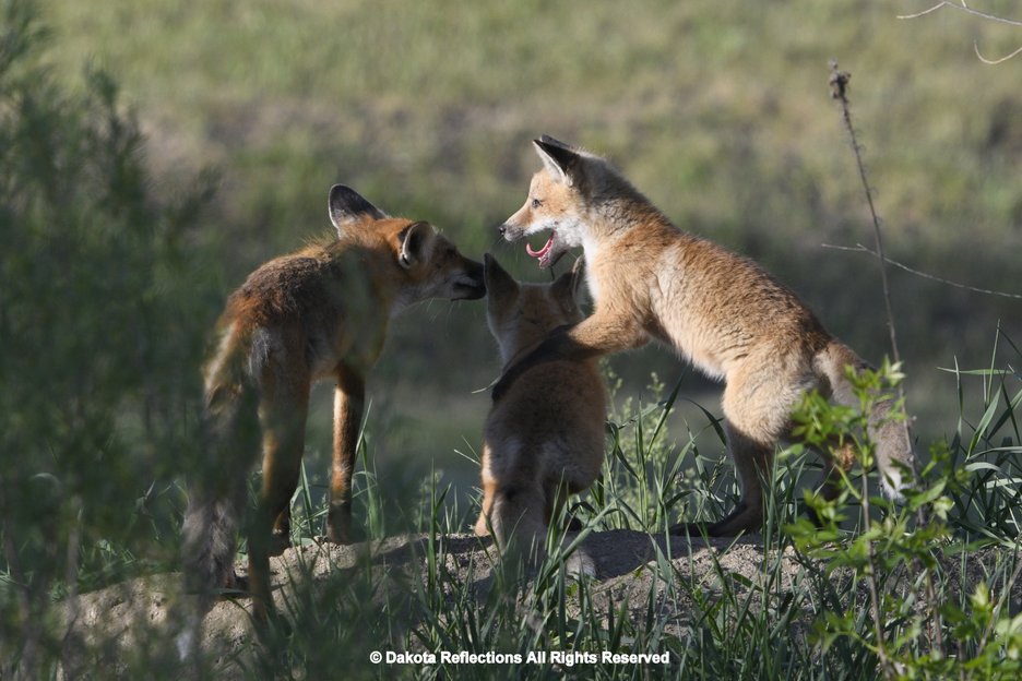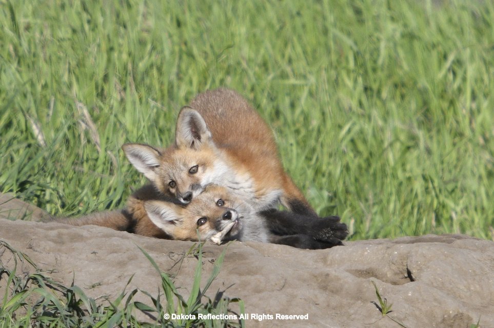 The den is dug by the fox family or modified from an abandoned badger burrow. Mating occurs during the winter with pups born in the spring after a gestation of 51 to 53 days. Litter size averages 5 with a range of 1 to 13. The kits weigh about 6 ounces at birth and their eyes open about 2 weeks of age. Their color is charcoal gray at birth. At two weeks the vixen can leave the den for hunting and the kits can maintain their body temperature in the den. At 1 month, the kits will begin fighting among themselves and establishing a pecking order from alpha to the omega. They are nursed for 2 to 2 ½ months. In early May, the kits are be seen for varying periods of time outside the den. They become more social and playful. At 5 weeks of age, their coat becomes lighter and matches more the surrounding dirt. Red fox hairs become evident and they begin to look more like their parents. By June in the Northern Plains, kits are accompanying their parents on hunting trips. By September to October, the kits have left the family, except some females may remain and assist in child raising next spring.