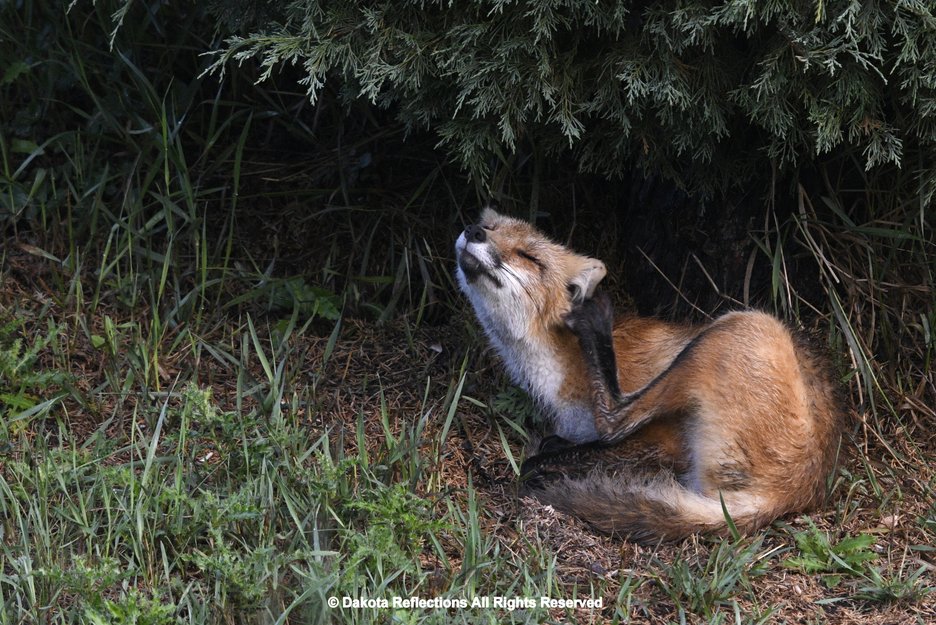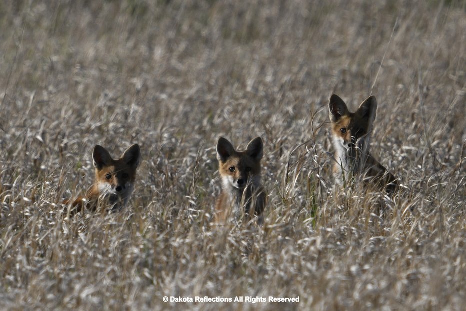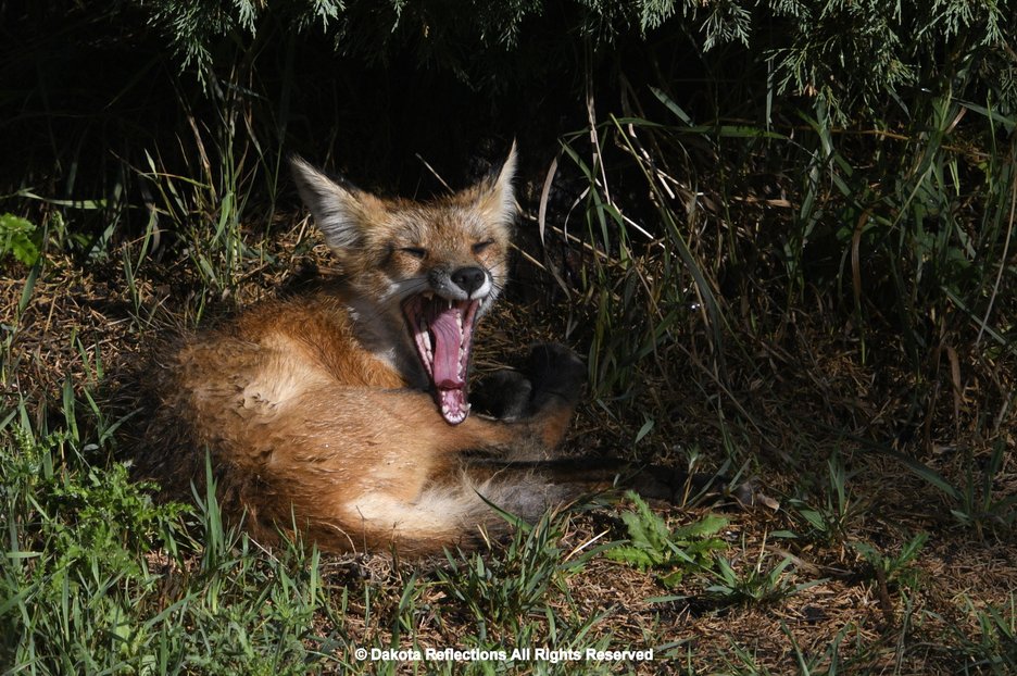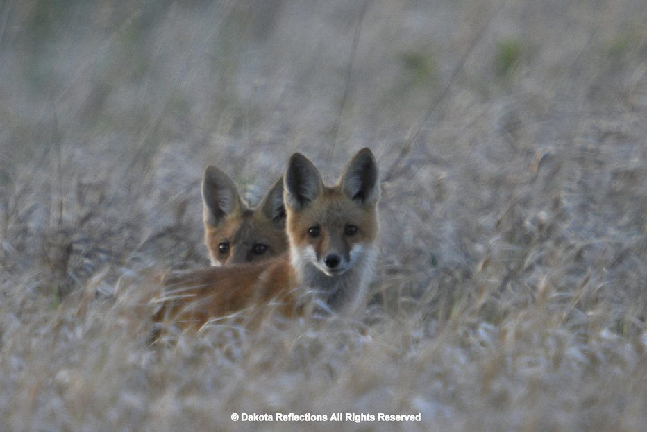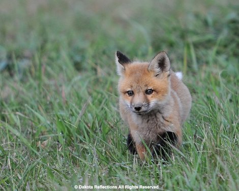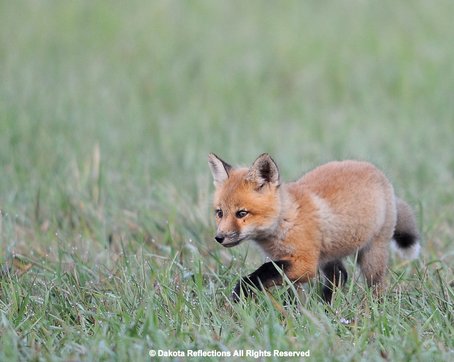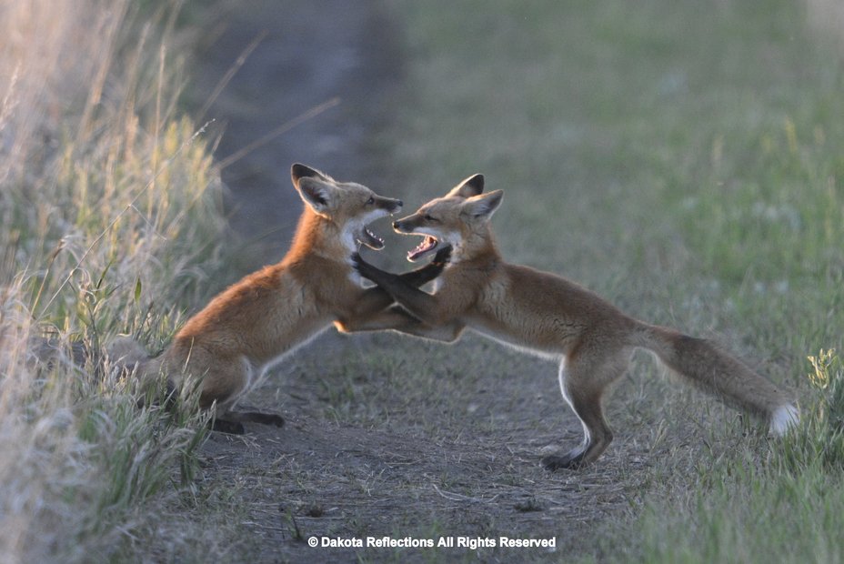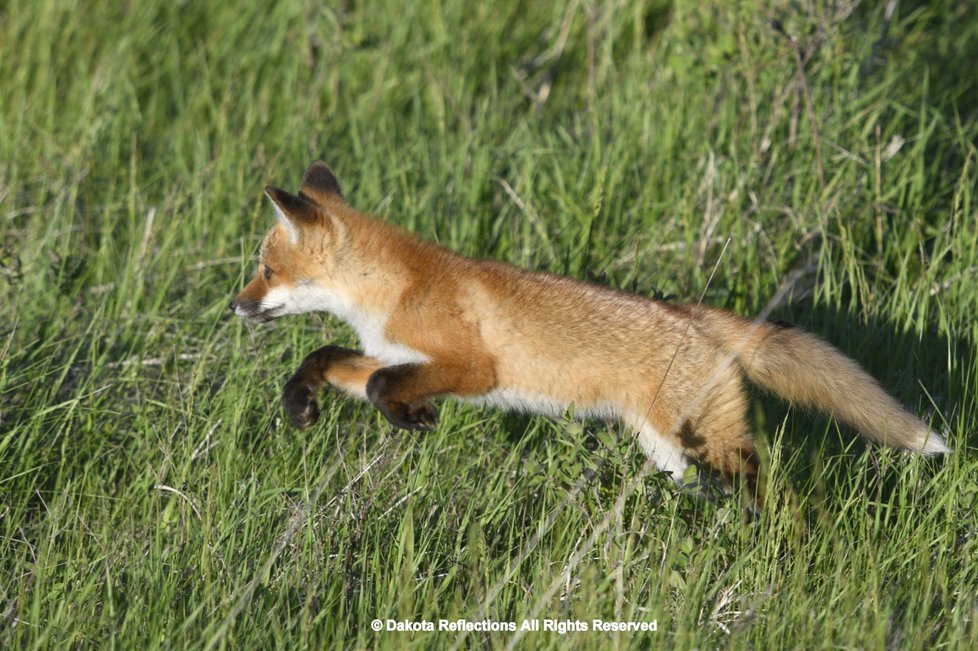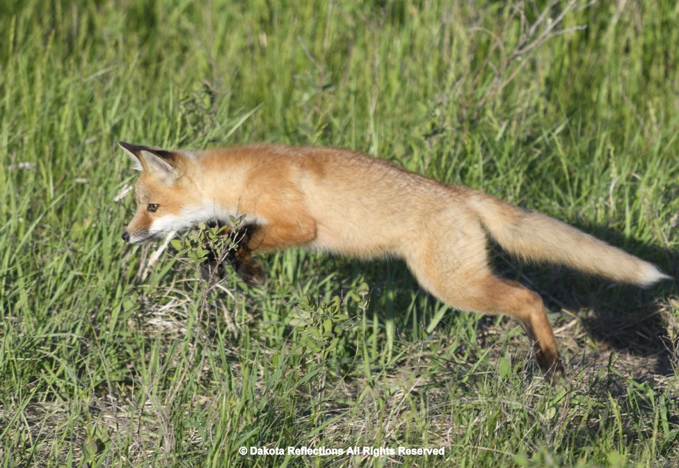 The den is dug by the fox family or modified from an abandoned badger burrow. Mating occurs during the winter with pups born in the spring after a gestation of 51 to 53 days. Litter size averages 5 with a range of 1 to 13. The kits weigh about 6 ounces at birth and their eyes open about 2 weeks of age. Their color is charcoal gray at birth. At two weeks the vixen can leave the den for hunting and the kits can maintain their body temperature in the den. At 1 month, the kits will begin fighting among themselves and establishing a pecking order from alpha to the omega. They are nursed for 2 to 2 ½ months. In early May, the kits are be seen for varying periods of time outside the den. They become more social and playful. At 5 weeks of age, their coat becomes lighter and matches more the surrounding dirt. Red fox hairs become evident and they begin to look more like their parents. By June in the Northern Plains, kits are accompanying their parents on hunting trips. By September to October, the kits have left the family, except some females may remain and assist in child raising next spring.